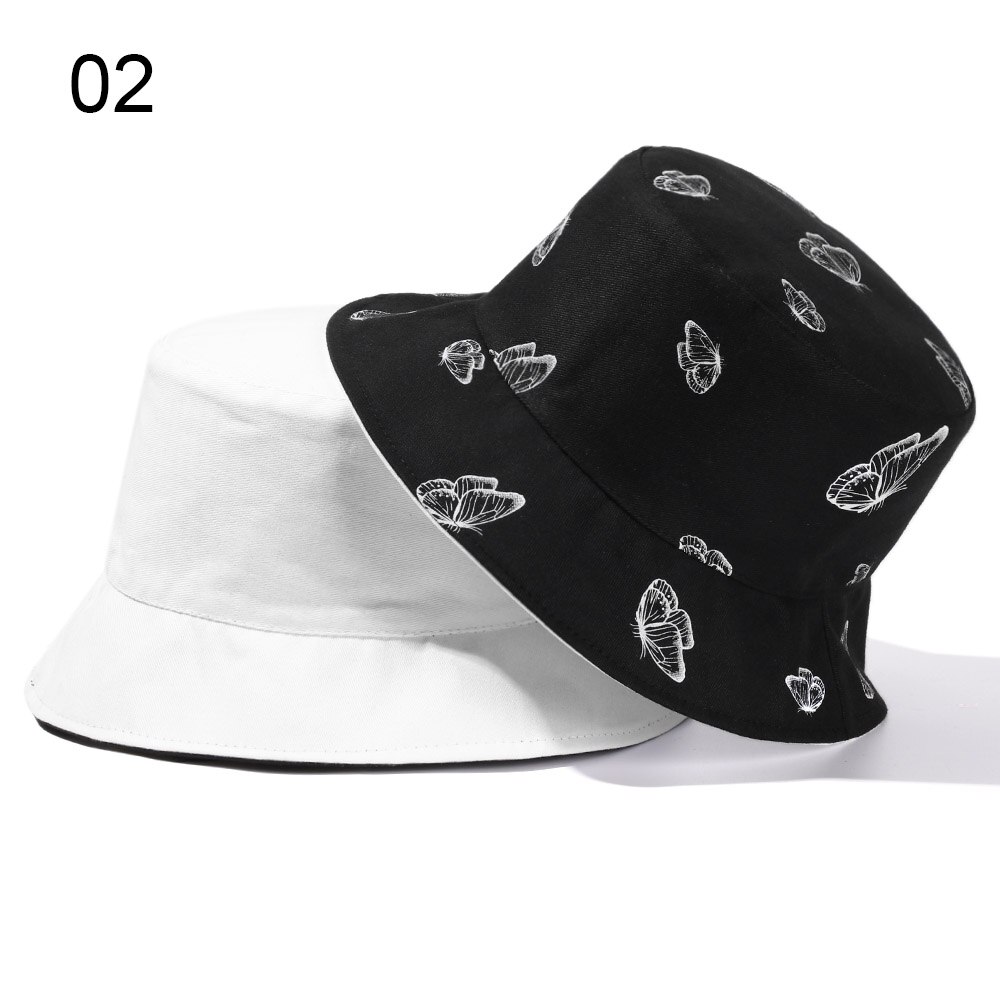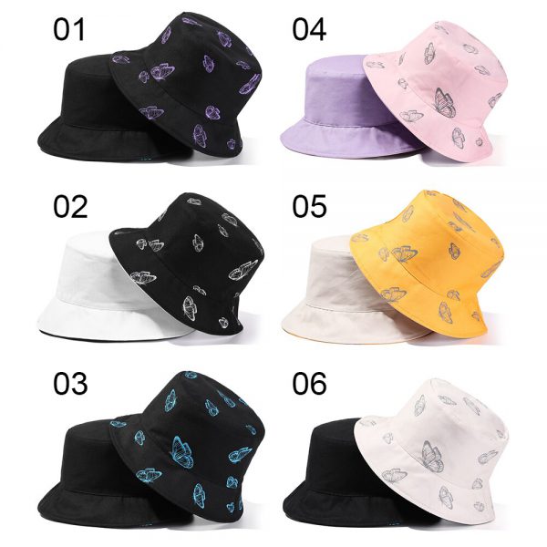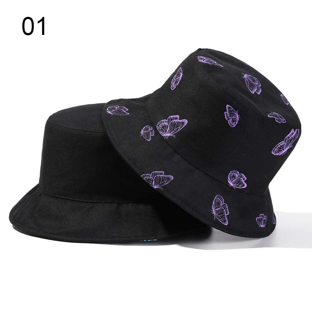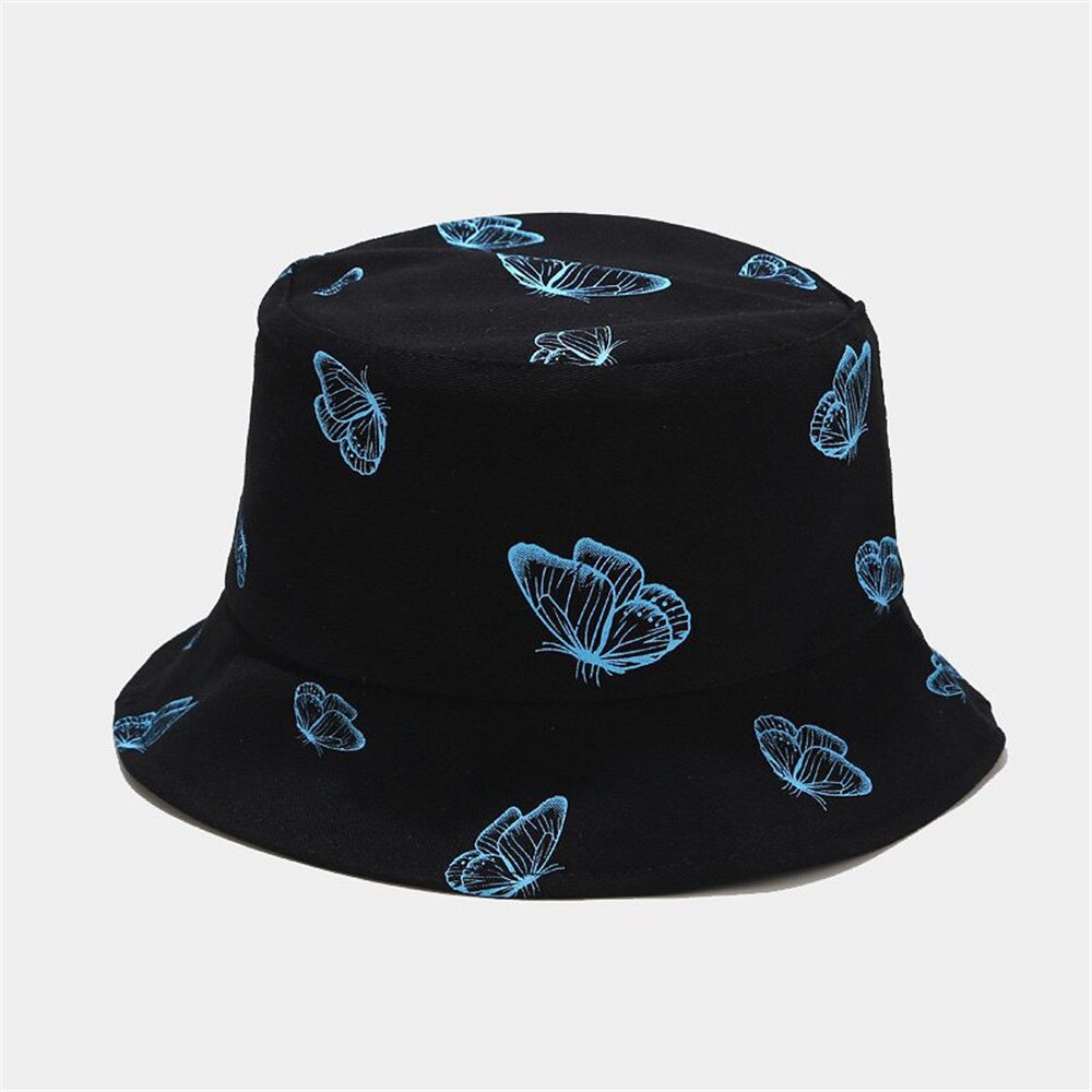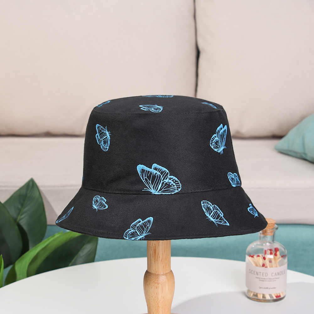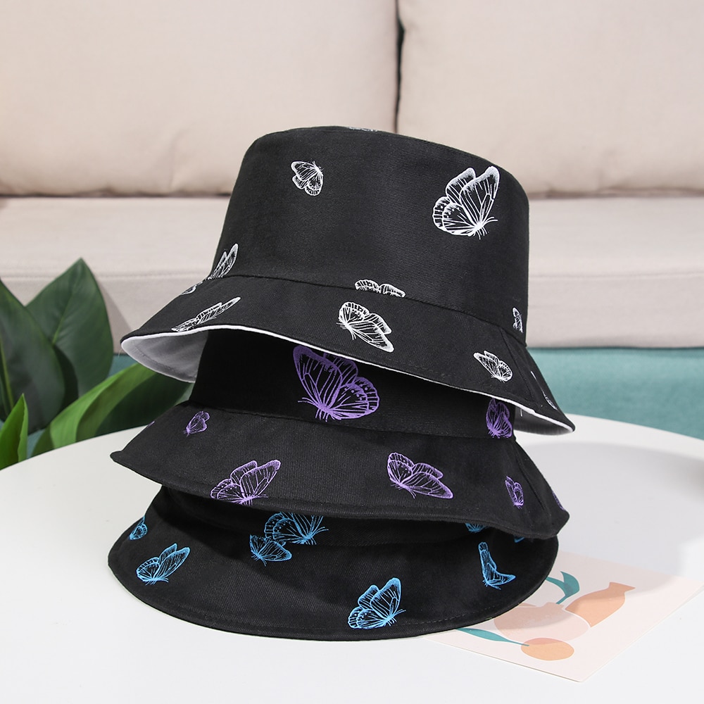 2024 New Black Butterfly Double-sided Bucket Hat Cotton Foldable Wide Brim Fisherman Cap Women Men Casual Outdoor Sunscreen Hat