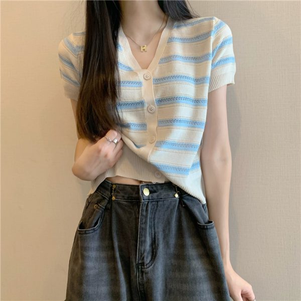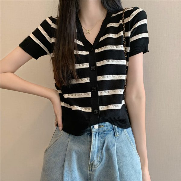 Ani Kang |korean Soft Sister Hollow Out Striped Short Sleeve Knitted T-shirt Women Fashion V-neck Slim Short Top Woman Casual Summer Top