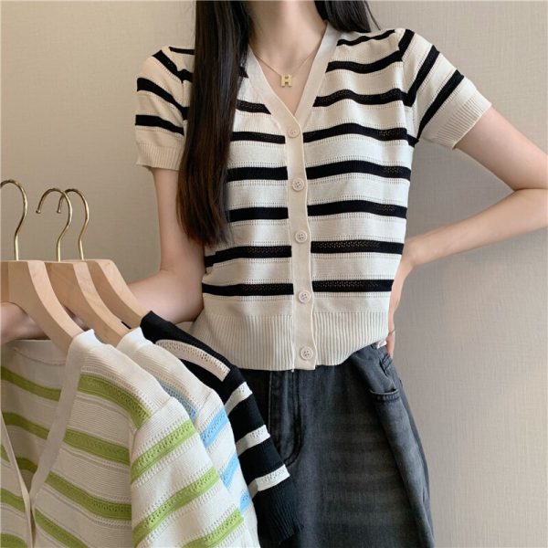 Be the first to review “Ani Kang |korean Soft Sister Hollow Out Striped Short Sleeve Knitted T-shirt Women Fashion V-neck Slim Short Top Woman Casual Summer Top” Cancel reply
