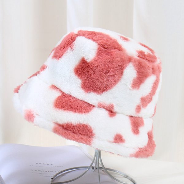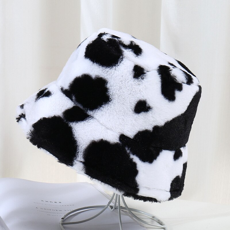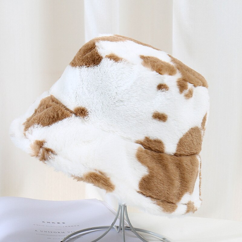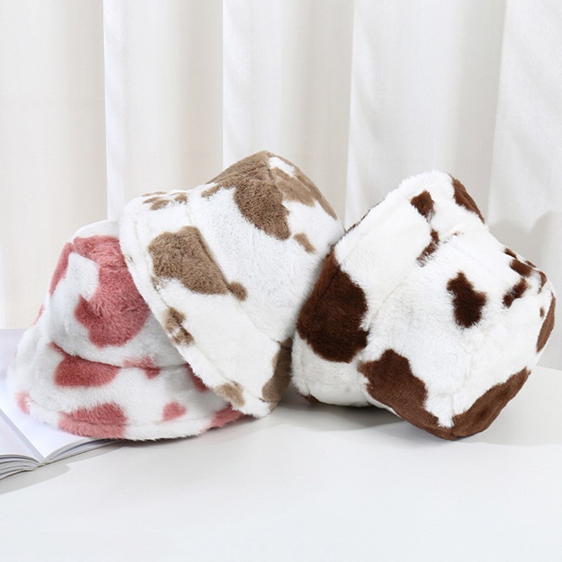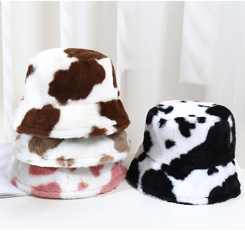 Fashion Plush Cow Print Bucket Hat Winter Warm Hats For Women Outdoor Sun Hat Female Girl Soft Panama Fishing Cap