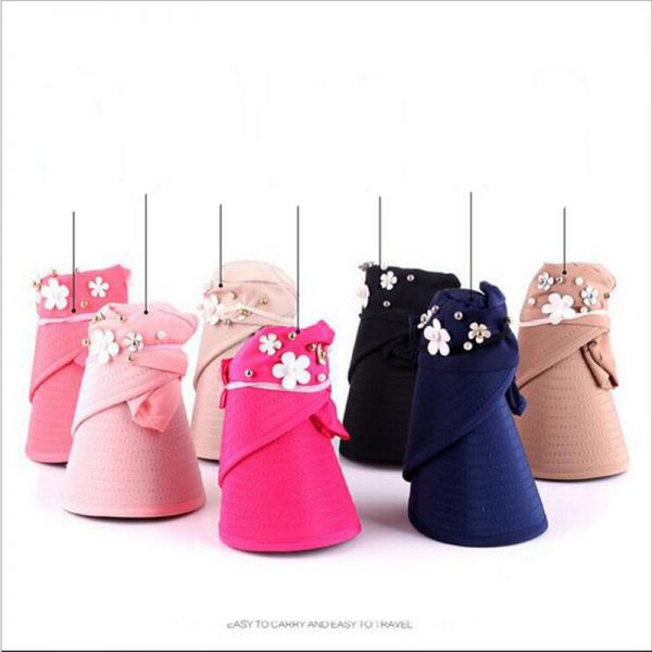 Summer Women Sun Hats With Flower Pearls Wide Brim Foldable Floppy Cap Outdoor Uv Protection Female Ponytail Beach Hat